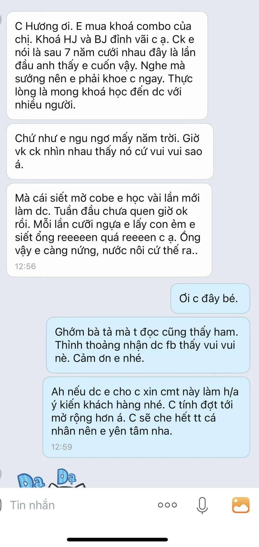Mình luôn tưởng là mình giỏi chuyện YÊU BẰNG MIỆNG cho tới khi m nghe 1 video Xuân Hương nói rằng khi ngậm sâu mà còn buồn ói là có nghĩa bạn chưa biết về THUẬT YÊU. M đang ký thử để học thì thực sự thấy cuốn. Hướng dẫn từng chi tiết, video quay cực nghệ”mình nghĩ phải có đội quay hùng hậu ;)” Nói chung sau khi học thì ck m nói nó chặt và khác hẳn. Giờ bọn m thực sự thích chuyện ấy chứ ko kiểu làm cho có như trước. Chúc cô XH có nhiều học viên.
